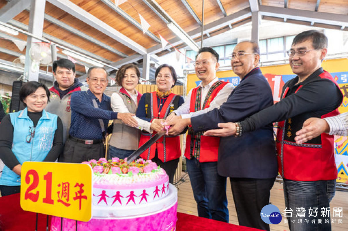 蘇副市長與來賓一同切蛋糕,歡慶桃園市原住民族部落大學21週年。