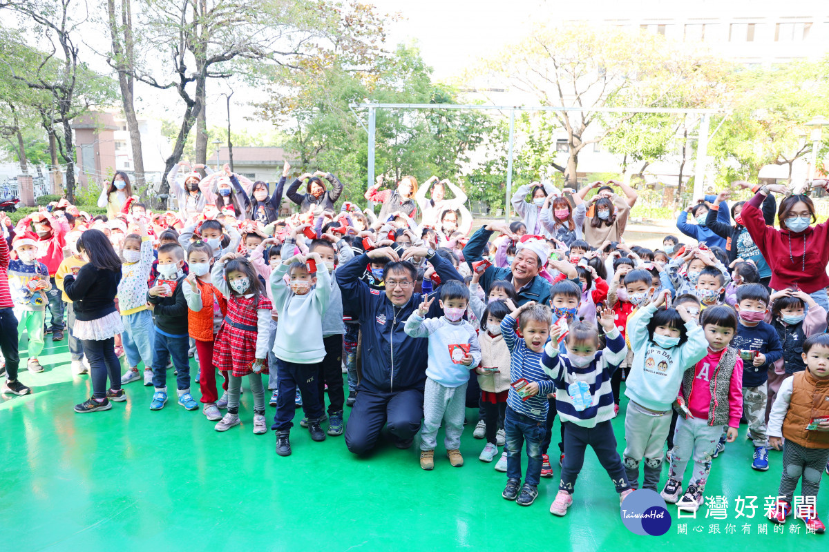 台南市政府員工子女非營利幼兒園25日歡慶聖誕佳節,台南市長黃偉哲擔任嘉賓驚喜現身,發放糖果給幼兒園約200位小朋友,並陪小朋友一起吹泡泡,讓小朋友們相當開心,現場洋溢滿滿聖誕氣氛。