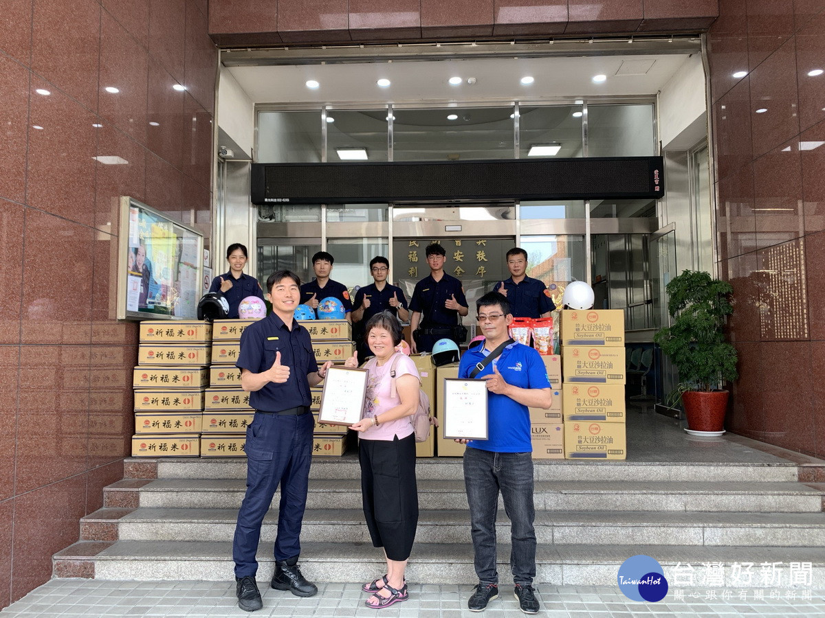 南投分局南投派出所集結來自臺南市的善心社會資源,結合民間力量,捐贈愛心物資幫助轄內貧困弱勢家庭,另提供員警宣導舉牌組及安全帽做為交通安全及法治教育宣導,26日中午在南投派出所舉行捐贈儀式,由臺南地檢署前書記官潘敏捷等人,到場見證祝福。