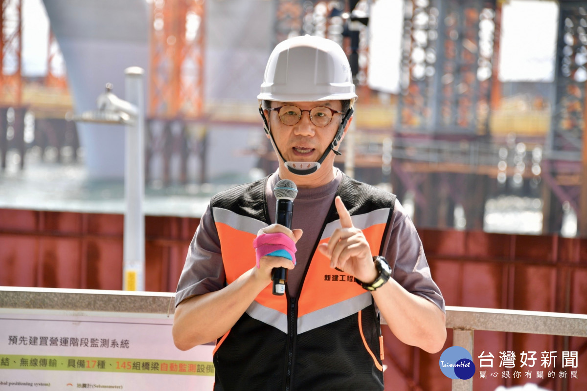陳院長指出,淡江大橋工程體現了兩大重要的深層意義,首先是讓大家看見臺灣作為一個自由、民主、多元及開放的國家,如何運用科技力量,打造塔高200公尺的主橋塔,向國際社會展示臺灣在建築科技領域的重要突破與發展,他要感謝施工團隊及所有工程人員的努力。