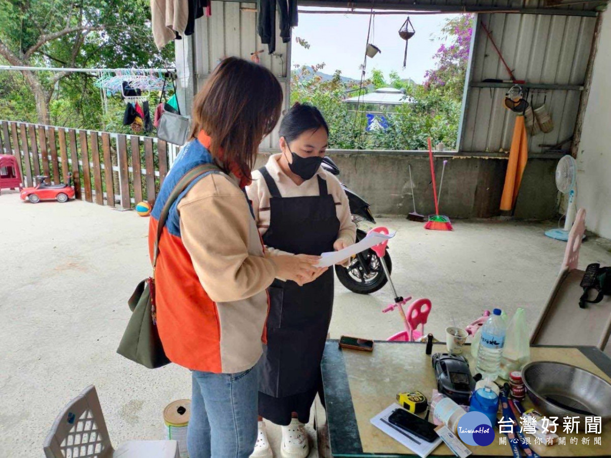 竹北就業中心就服員向吉娃思.羅幸(右),詳細說明照顧服務就業獎勵。