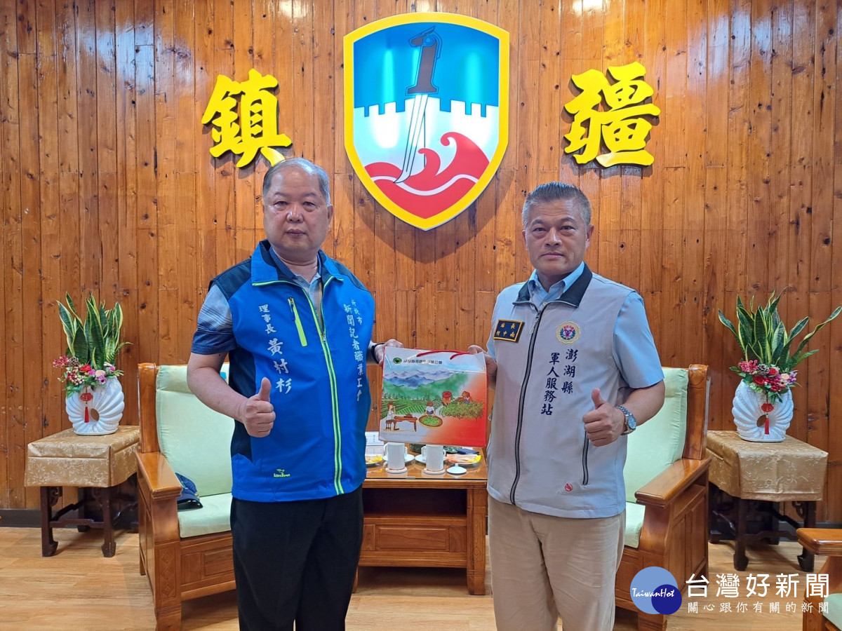 此外,黃理事長也感謝新北市軍人服務站吳遠里站長、澎湖縣軍人服務站何中南站長協助安排,始能促成這次的溫馨敬軍活動。在敬軍活動結束前,黃理事長代表記者工會致贈伴手禮給澎湖縣軍人服務站,澎防部郭指揮官也致贈敬軍團成員創意帽子及澎湖名產伴手禮,讓此次敬軍活動充滿溫馨,並指下半年度將再規畫安排澎湖的敬軍活動。