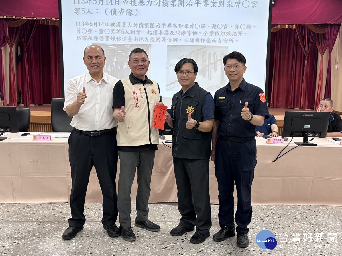 南市警局長廖宗山與大台南警察之友會理事長蔡明憲及多位理事,前往白河警分局頒發破案有功人員慰問金、破案茶/警方提供