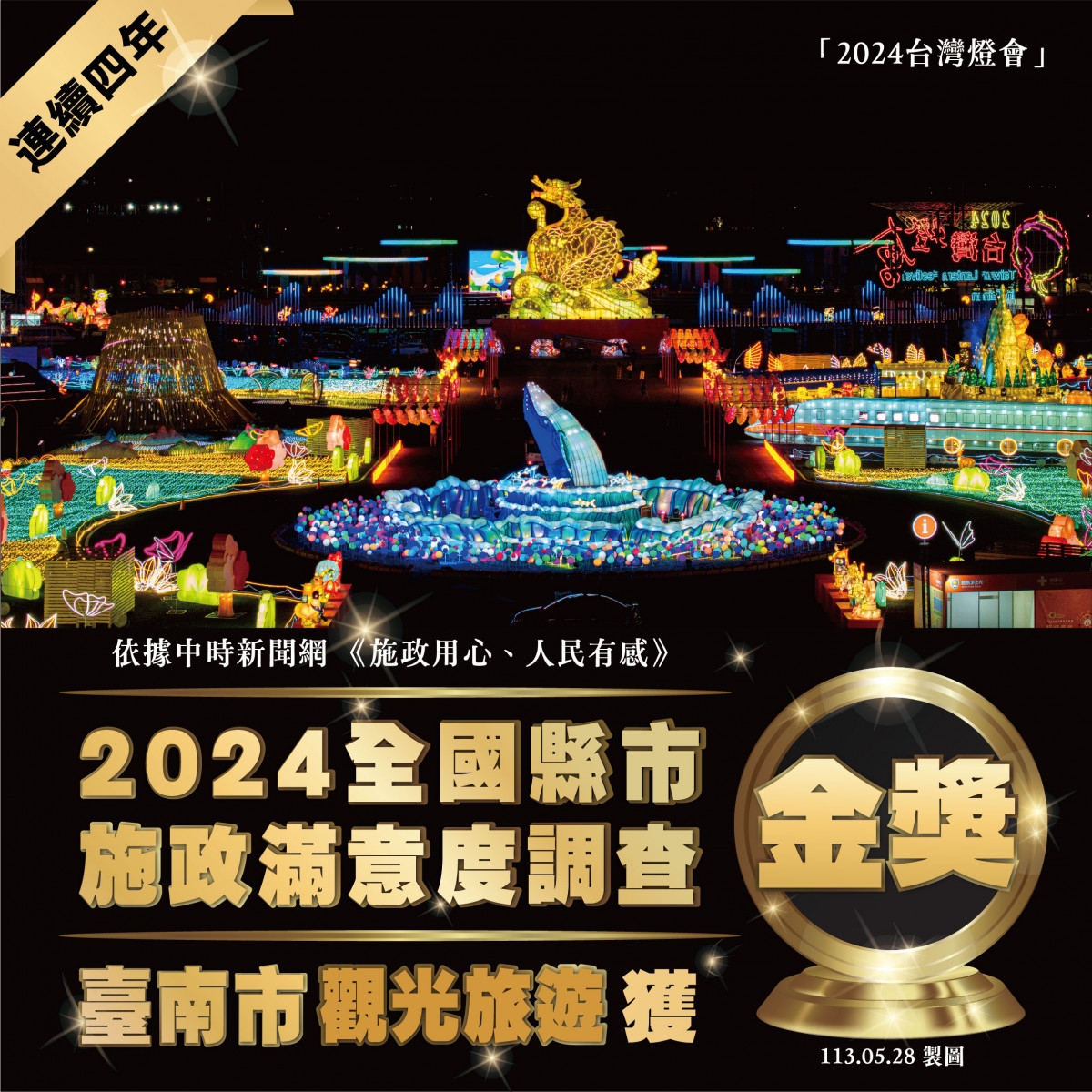 中時新聞網28日公布2024各縣市施政滿意度調查成績,臺南市在「觀光旅遊」構面拿下金獎。黃偉哲市長表示,臺南市的觀光旅遊一直非常有實力,在中時新聞網的各縣市施政滿意度調查中已連續4年獲得金獎。