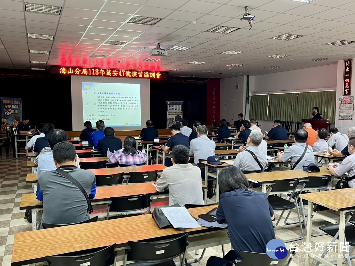 113年度北部地區(新竹以北)軍民聯合防空「萬安47號」演習將於7月23日下午1時30分至2時發放警報,實施30分鐘人、車疏散避難、交通管制及燈火管制等實作演練,新北市政府警察局海山分局今(12)日下午2時召開演習協調會,分局長陳保緒親自主持。