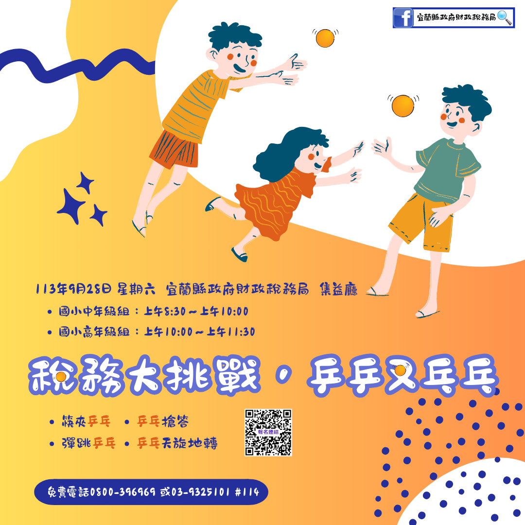 宜蘭縣政府財政稅務局為推廣財政部重要稅政及創新租稅措施,以乒乓球為媒介設計4種闖關遊戲,訂於113年9月28日星期六在該局集益廳舉辦「稅務大挑戰,乒乒又乓乓」趣味競賽活動(簡章連結:https://reurl.cc/Orqyp7)。