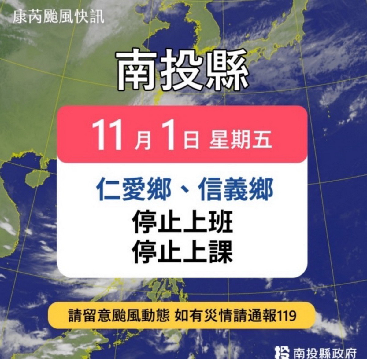 南投縣政府晚間宣布,11月1日(星期五)仁愛鄉與信義鄉停止上班上課,其餘各鄉鎮市都照常上班上課。