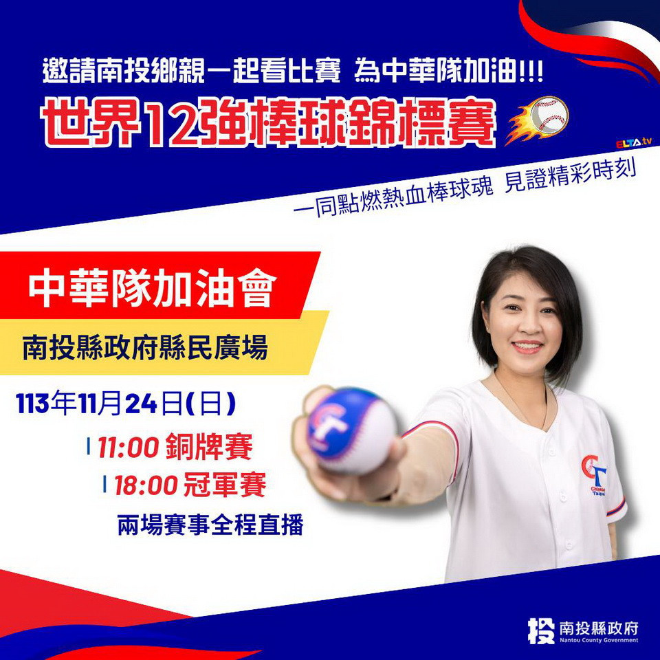 2024年世界棒球12強賽熱力開打,中華隊在預賽以4勝1敗的優異成績挺進東京四強,展現堅強實力,令全台球迷振奮不已!為了支持中華隊確定晉級冠軍戰,南投縣政府特別於24日(日)下午5時30分起在縣民廣場舉辦戶外加油會與賽事實況轉播,縣長許淑華邀請鄉親與球迷共同參與,一起為中華健兒加油吶喊,感受現場熱血沸騰的氛圍。