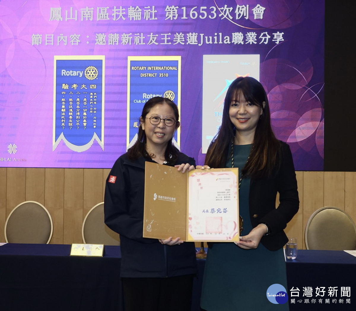 ▲蔡宛芬局長致贈鳳山南區扶輪社社長張淑鈴女士感謝狀。