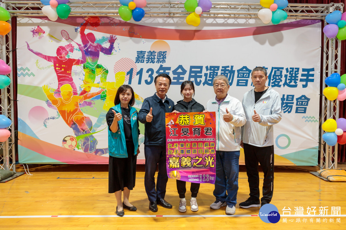 教育處表示,嘉義縣政府建立三級培訓制度、提高運動獎勵金、發給連霸獎勵金、提高參賽補助、培訓計畫等,協助選手順利完成各項競賽、榮耀奪牌,並同時頒獎表揚軟式網球江旻育選手,參加第17屆世界軟式網球錦標賽榮獲女子單打、女子團體第3名,從國小、國中、高中一路都是在地培養,嘉義縣健兒成績有目共睹。