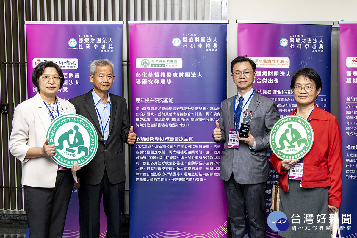 彰基劉森永醫療長(右二))率團代表受領113年度醫療財團法人社研卓越獎【研究發展獎】。圖/彰基醫院提供