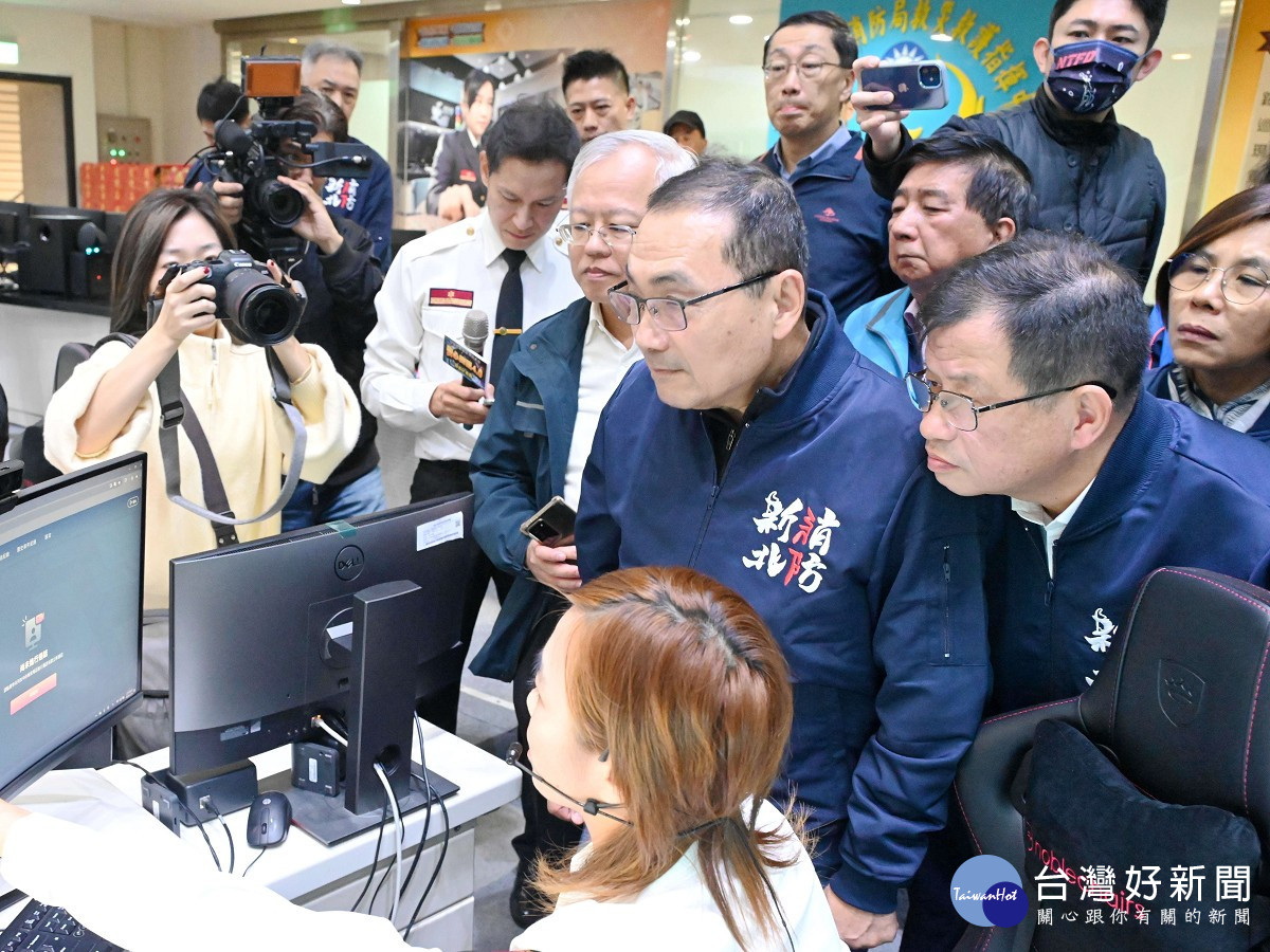 新北市政府消防局今 (18)日於4樓救災救護指揮中心辦理全國首創安心簡訊4.0智能視訊報案系統記者會,邀集府內、外單位及各協力承商共襄盛舉,市長侯友宜親自出席,並對119人員需保持高強度應變能力、高張力危機處理深感辛勞,也特別於農曆春節前頒發119值勤人員加菜金及慰問品。
