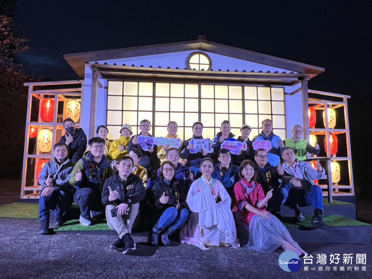 劉和然表示,天元宮除了是地方上重要的信仰中心,也是春節期間熱門的賞櫻景點,今年的夜櫻點燈時間為每日下午5:00至晚間8:00,歡迎大家前往欣賞。今年的櫻花季活動場佈及光影設計榮幸邀請到《茶金》美術指導、多次入圍金鐘與金馬獎的賴勇坤總監操刀,打造主題區「櫻之光屋」,以濃厚的日式懷舊氛圍與充滿時代感的復古場景,成為新年不可錯過的打卡熱點。