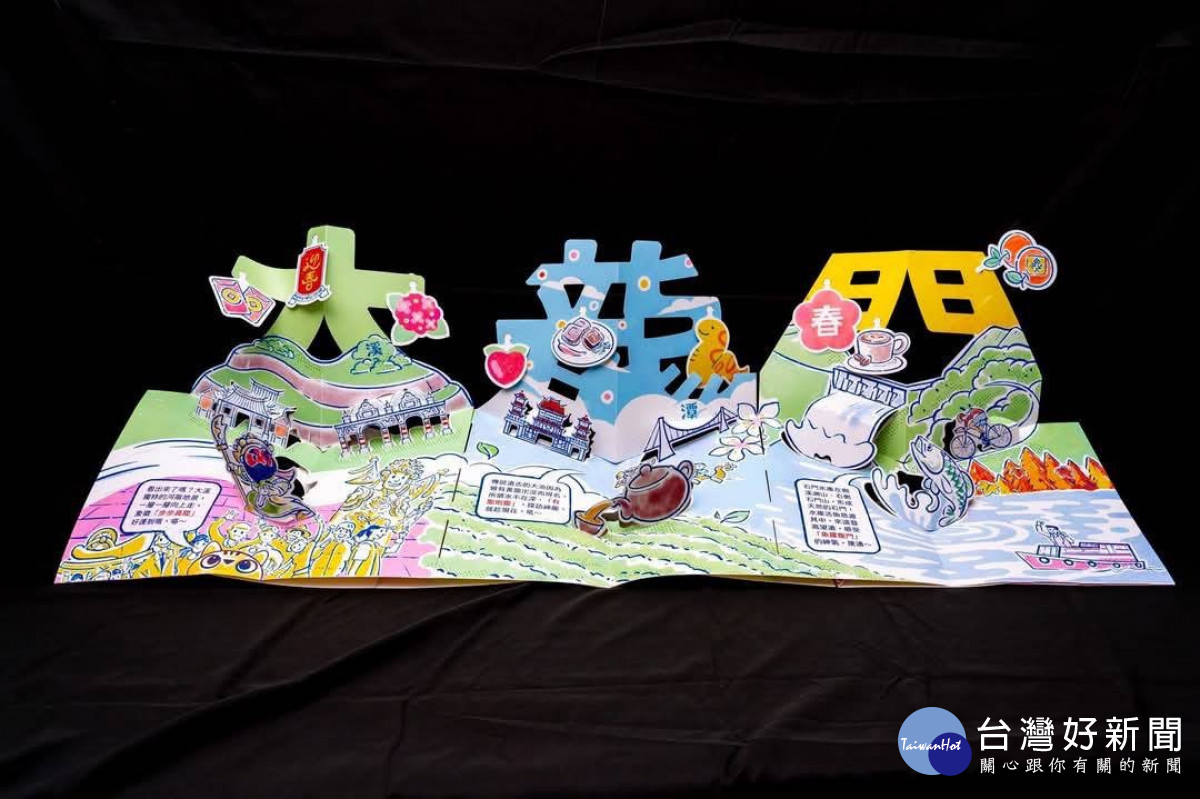 桃市府觀旅局周柏吟局長表示,甫推出就超吸睛的非來BOOK立體摺頁,是由知名摺紙藝術家洪新富老師及插畫家蕭民遠親手操刀,強強聯手將在地的觀光景點和文化元素躍然紙上。想體驗「步步高陞」大溪河階地形美景或是龍潭昔日黃龍現身「有龍則靈」神話,抑或是溪洲山、石門山構成石門「魚躍龍門」的壯闊景觀,透過立體摺頁讓景點介紹更生動有趣。