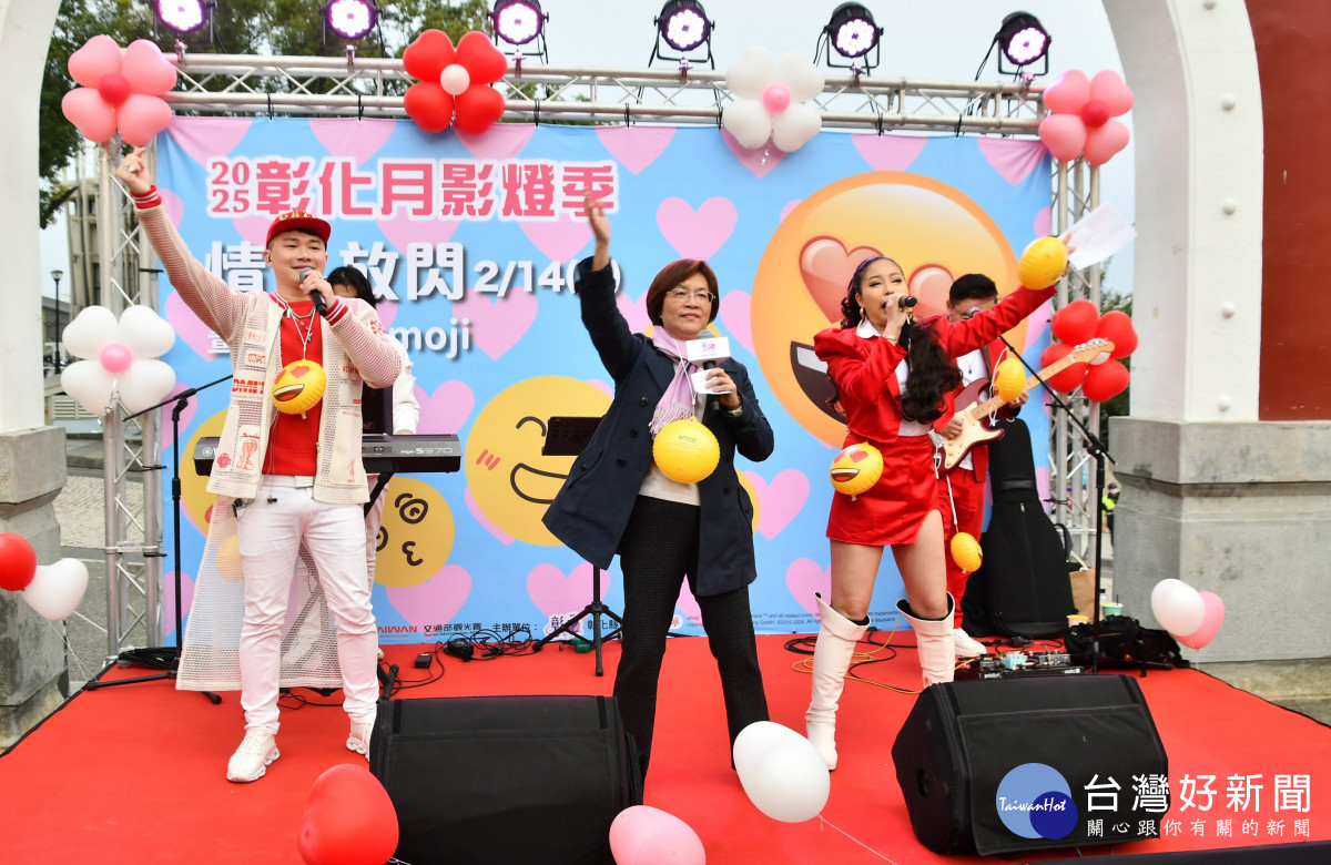 2025彰化月影燈季系列活動-情人放閃,「畫出emoji 情人齊放閃」於今(14)日西洋情人節傍晚,由彰化縣長王惠美及現場520對情人在八卦山大佛風景區參佛道階梯,公開放閃,在黃色氣球上創作自己的emoji,畫出代表現在心情的表情,互相表白心意,當日也發放1040個特別版愛心emoji小提燈,還有超級大咖樂團現場演唱,度過一個難忘的情人節。