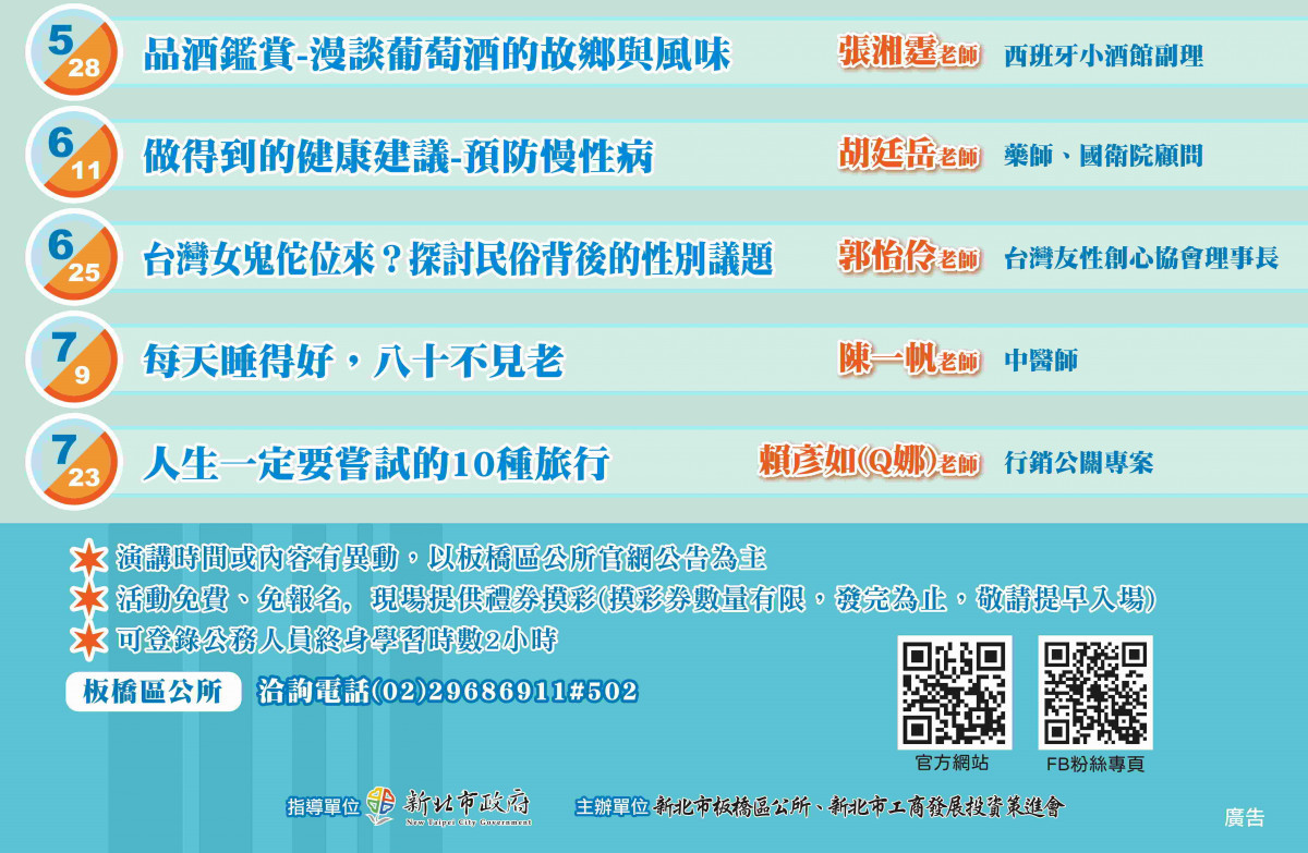 「板橋生活講座」備受好評!板橋區公所人文課指出,2025上半年度將於3月至7月的週三晚間7時起共舉辦10場,地點於板橋區公所6樓禮堂(板橋區府中路30號)。上半年講題包含醫學保健、樂齡關懷、法律常識、異國文化、親子教育、兩性教育等面向,邀舊雨新知一起來聽講。