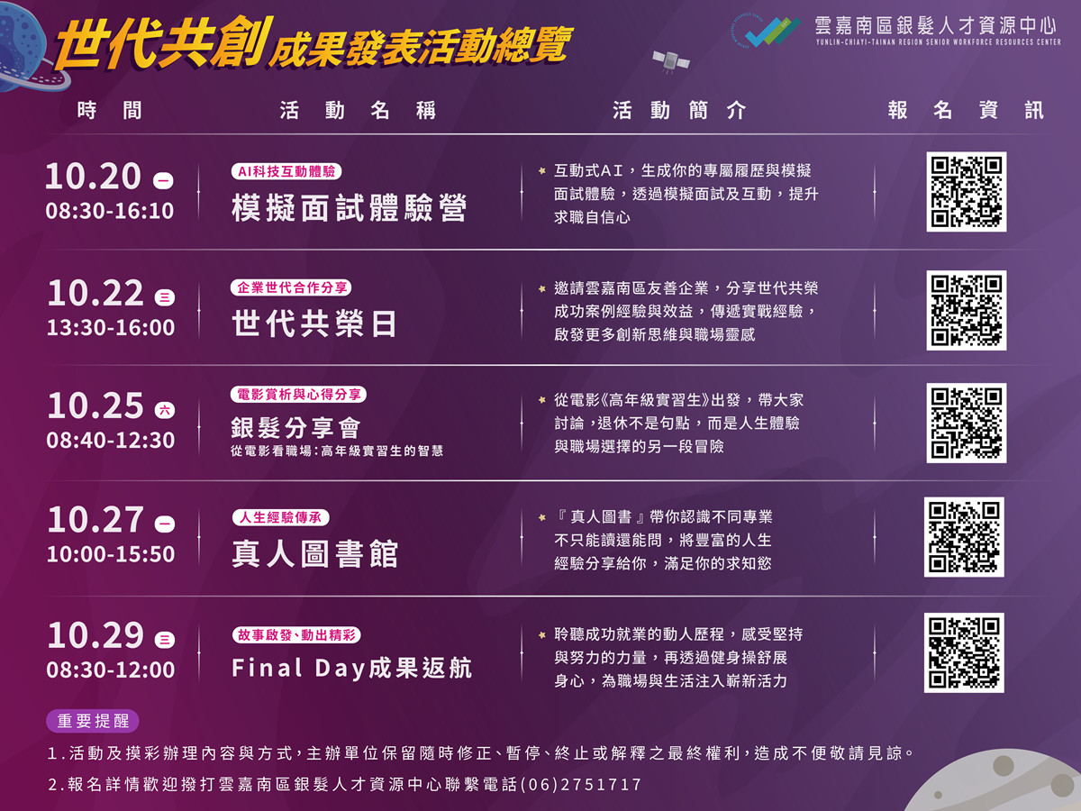雲嘉南區銀髮人才資源中心成立滿周年,特別舉辦「世代共創成果發表週」,自10月20日至10月29日 除了展出服務成果展外,另外規劃五場精彩活動,邀請長者與有興趣的民眾共同參與,透過跨世代交流、電影探討、真人故事分享與舒活健身體驗,展現銀髮人才的多元能量。