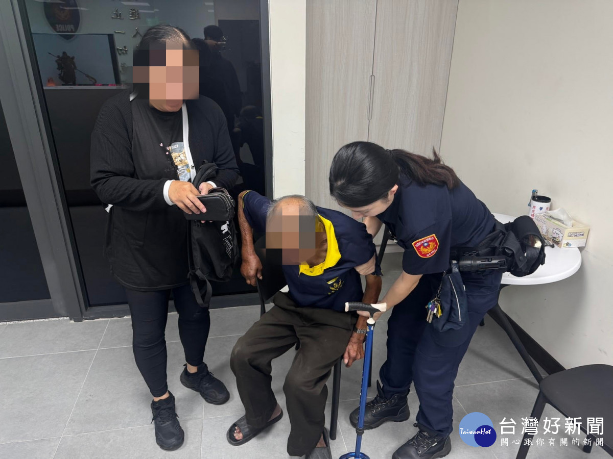 員警到場後發現,這名78歲的詹姓老伯伯拄著拐杖行動緩慢、語焉不詳,無法清楚說出自己的身分資訊,員警擔心詹伯伯的身體狀況,決定先將他攙扶上巡邏車,帶回派出所稍事休息,並主動提供飲水安撫情緒。
