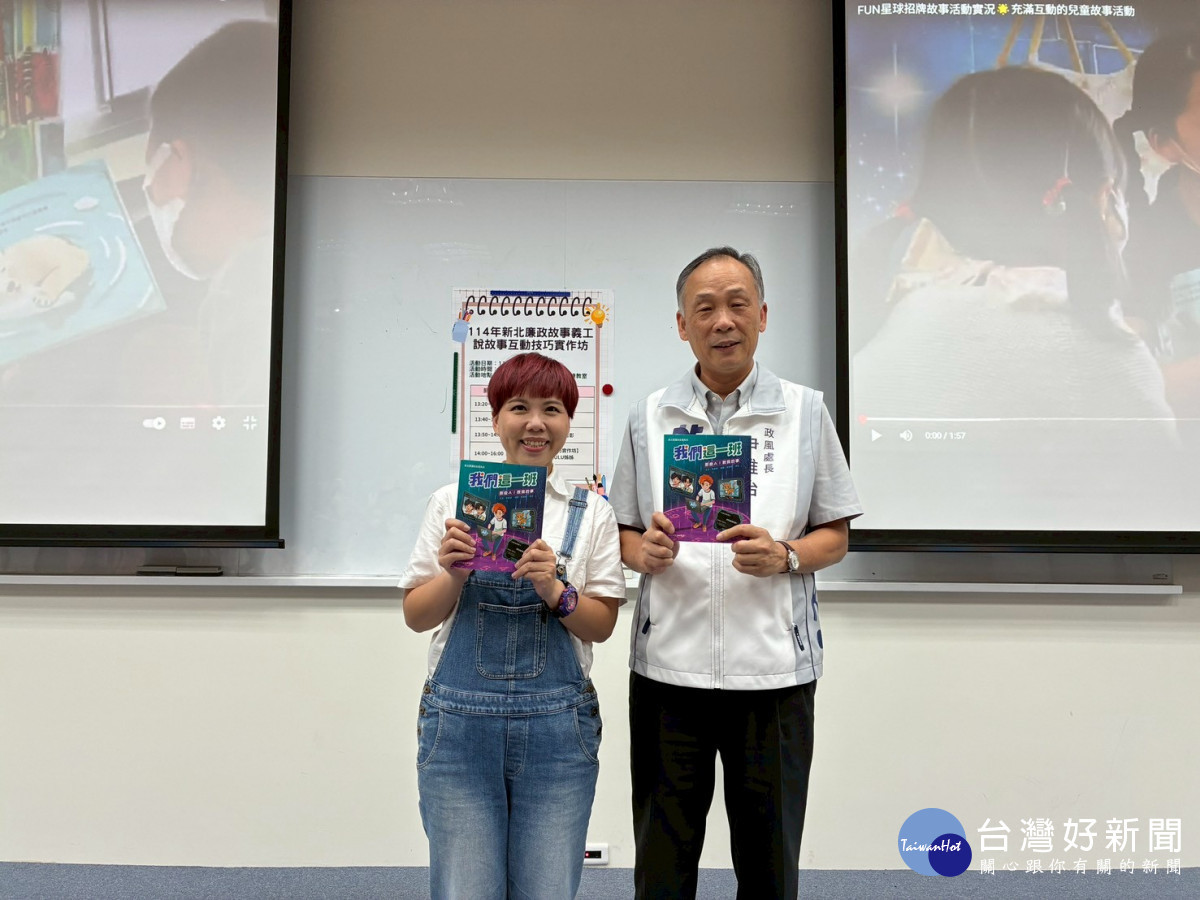 新北市政府政風處昨(16)日舉辦「廉政義工說故事互動技巧實作坊」活動,邀請知名兒童說故事Podcast頻道「FUN星球 放故事」的LULU姊姊擔任講師,分享豐富的實務經驗。實作坊特別結合政風處於今年出版的廉政故事書《我們這一班:那些AI教我的事》,透過生動有趣的教學與實際演示,向廉政義工分享如何運用聲音表情、肢體動作與角色扮演,將廉潔教育融入現今最熱門的AI議題,並轉化為孩子們聽得懂、聽得進去的有趣故事。