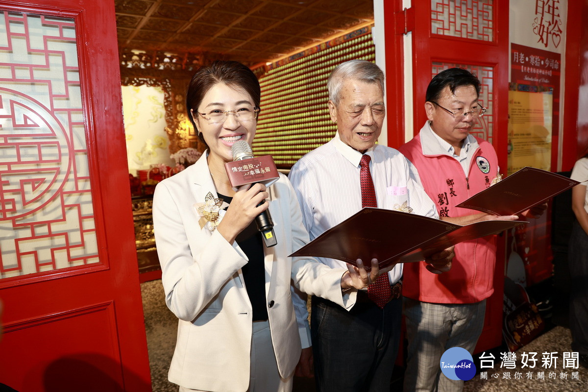 文武廟董事長張德林與魚池鄉長劉啟帆賢伉儷也到場為新人們祝福。(南投縣府提供)