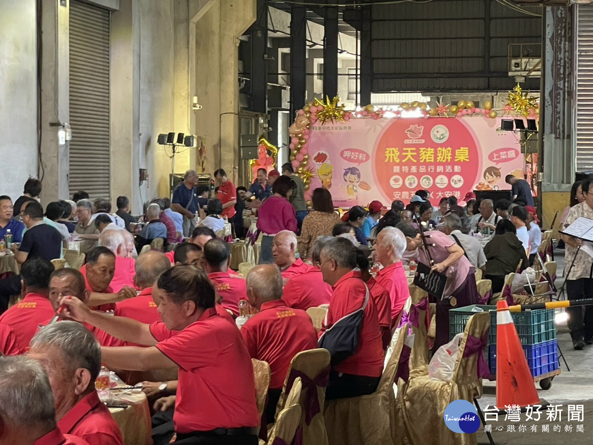 大安區飛天豬辦桌農特產品行銷活動,三百人士品嚐在地主要農特產十一佳餚,場面熱鬧溫馨,展現地方團結的力量。(記者陳榮昌攝)