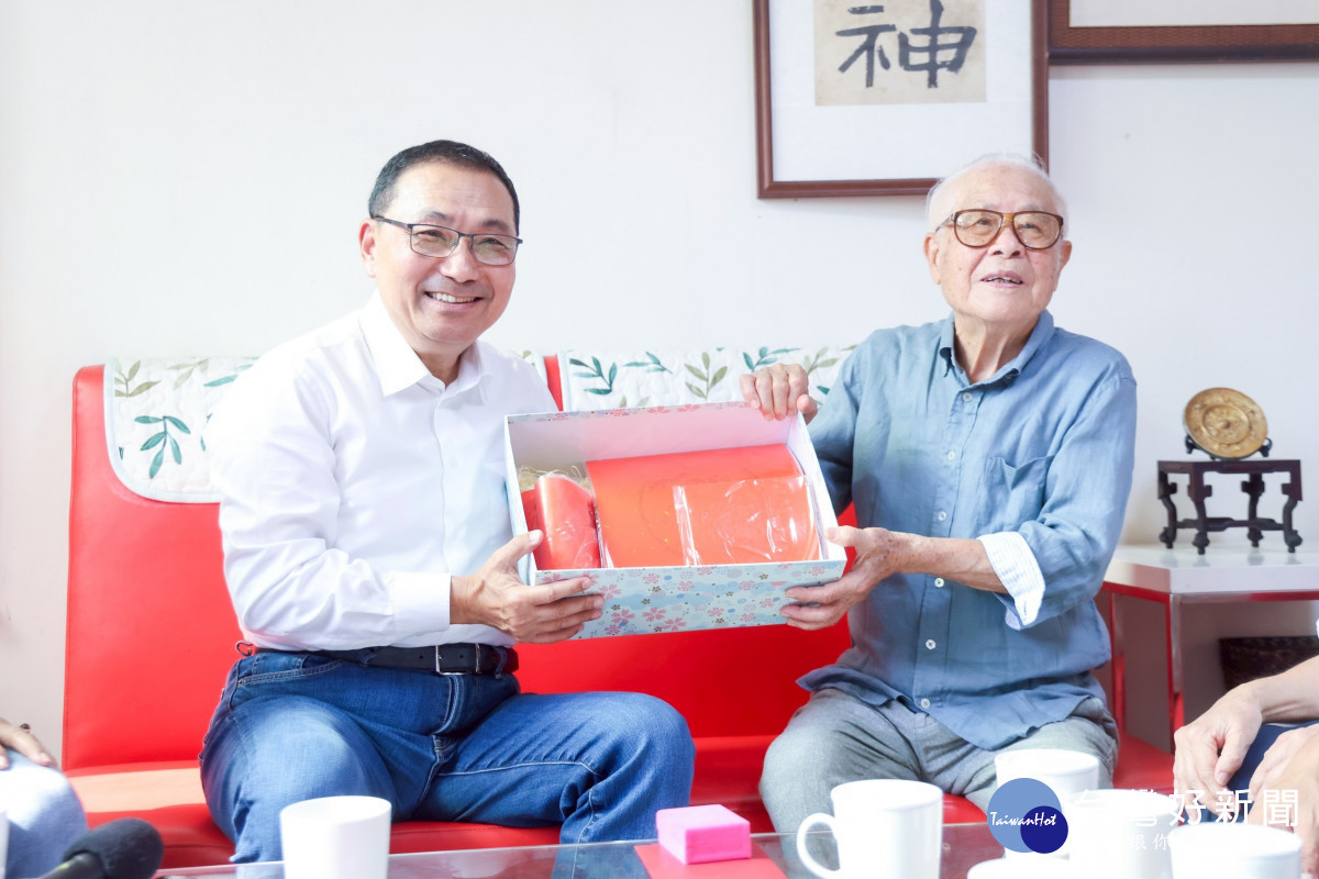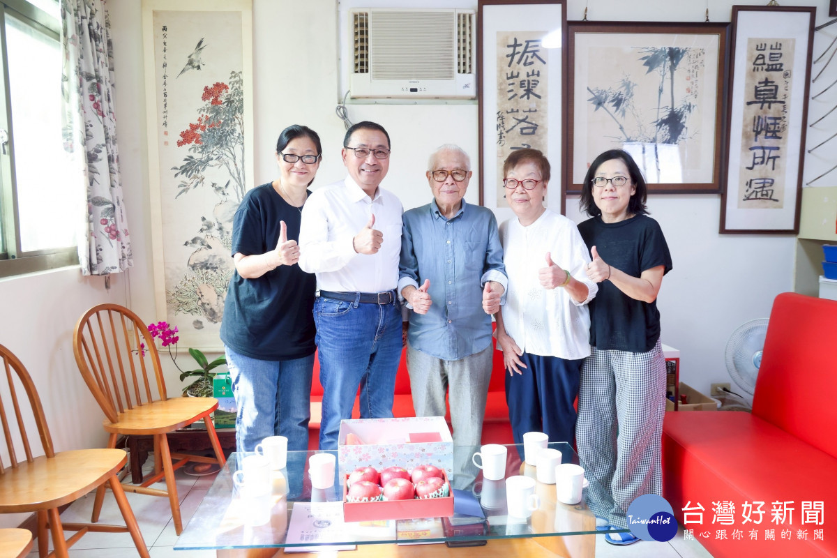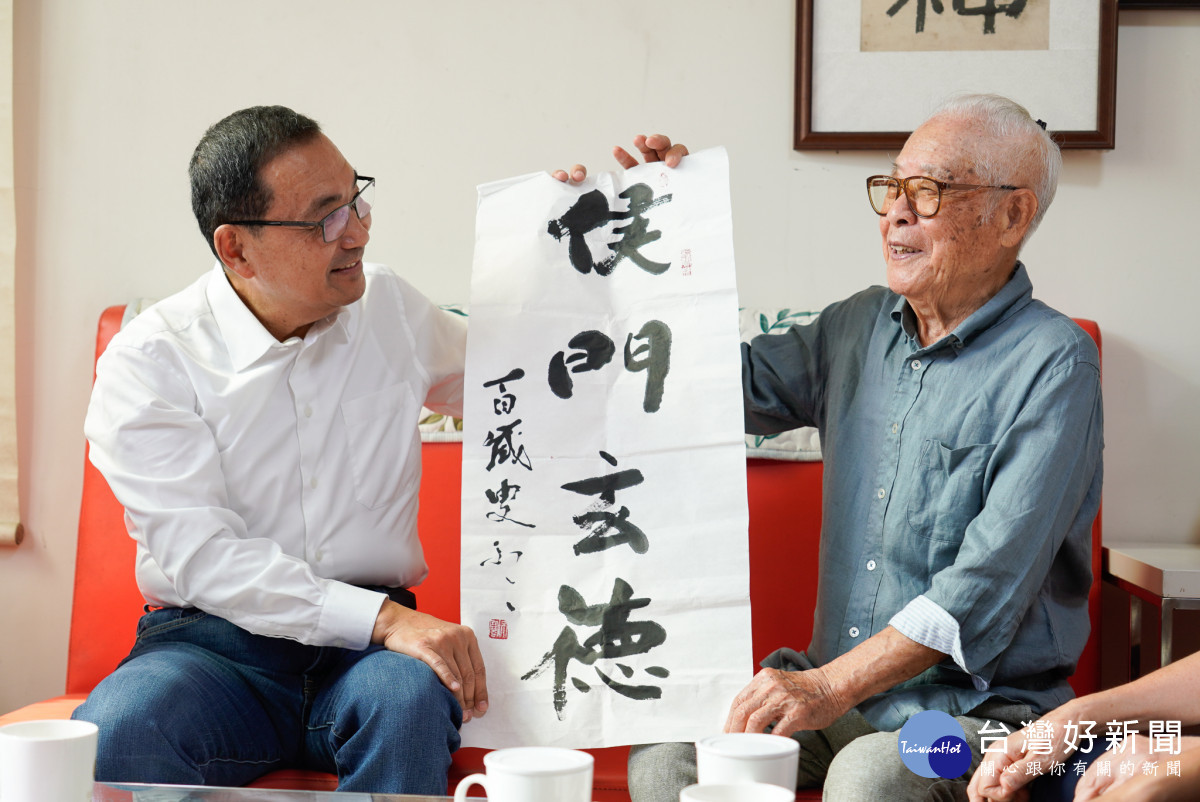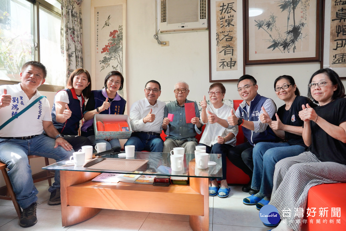 新北市長侯友宜今(18)日偕立法委員洪孟楷、社會局長李美珍及林口區長鄭淑敏等前往林口探視沈伯伯夫婦,並送上金鎖片與紅宣紙,表達敬老與祝福之意!沈伯伯開心收下紅宣紙,笑說這樣能讓他寫下更多作品,再贈送給更多朋友。