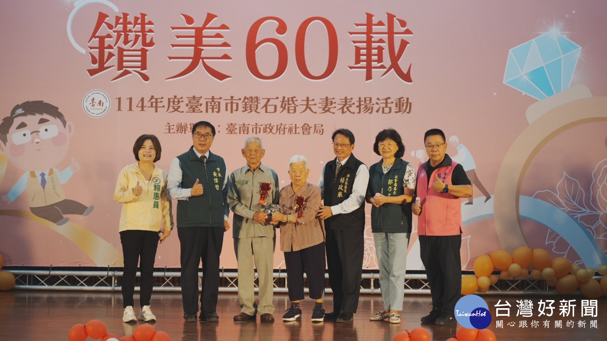10月為重陽敬老月,台南市政府社會局今(18)日舉辦「114年度台南市鑽石婚夫妻表揚活動」,由市長黃偉哲親自頒贈匾額並獻上祝福,表揚33對婚齡超過60年的鑽石婚夫妻,感謝他們以真摯情感與堅定承諾,樹立世代相傳的家庭典範。