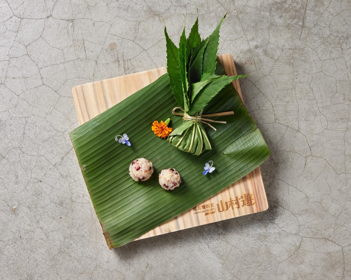 前菜部分,則取材於獵人以「八角金盤葉」包裹小米與煙燻肉作為狩獵口糧的故事,轉化為文化再現的「獵徑充糧—林霧蒸香獵人粽」。(林業及自然保育署南投分署提供)
