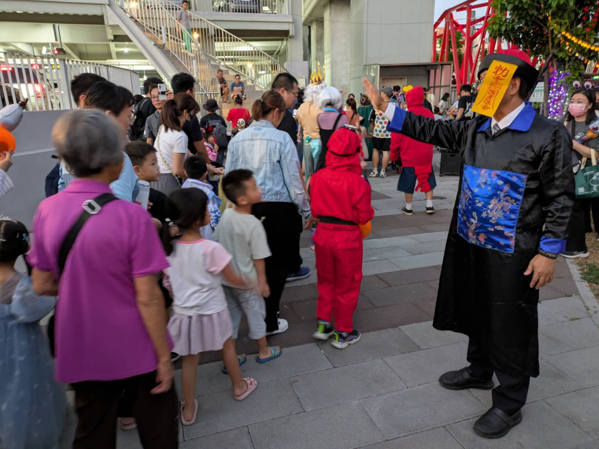 同時間開跑的「萬聖闖關遊戲」,設於後站廣場、戶羽機關車園區旁小公園與台鐵舊宿舍三大關卡,只要完成任務就能獲得限量「半半摺疊扇」,吸引許多家庭組隊出發挑戰,大小朋友玩得不亦樂乎。