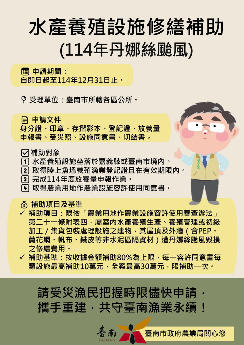 受到丹娜絲颱風、0728豪雨及楊柳颱風接連侵襲,臺南市主要魚塭養殖區受創嚴重。為協助養殖漁民儘速修復受損設施、恢復生產,經市府建議獲農業部同意辦理「水產養殖設施修繕補助」,市長黃偉哲呼籲,凡符合救助資格之漁民,應把握申請期限,於114年12月31日前向魚塭所在地區公所提出申請,以利後續救助審核與撥款作業順利進行。