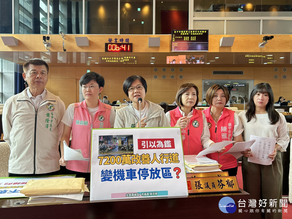 台中市議會交通地政業務質詢,市議員張芬郁、謝家宜、陳雅惠、蕭隆澤、陳俞融、陳淑華聯合質詢,關心從「人本交通」衍伸的道路人行道改善工程。市議員張芬郁指出,至今年9月,台中市登記的機車數量多達189萬5737台,但台中市公有和民營機車停車格,總計才18萬4412格,市民機車停車位嚴重不足。