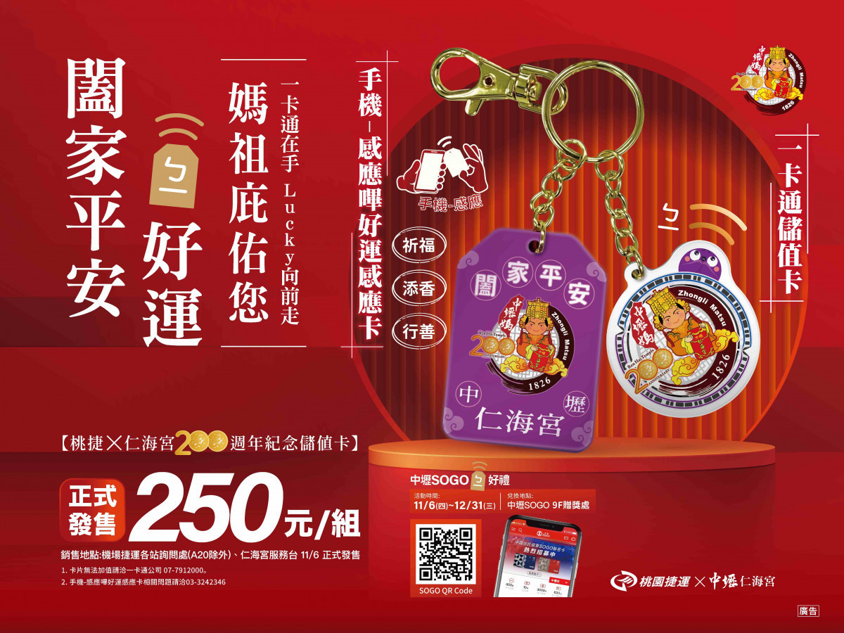 為歡慶中壢仁海宮建廟200週年,桃園捷運公司攜手仁海宮推出聯名紀念商品─「桃捷x仁海宮200週年紀念儲值卡」,一卡通儲值卡的卡面特別以Q版中壢媽進行設計,有別於以往神明給人嚴肅的形象及感覺,款式可愛、吸睛又療癒,大人小孩都喜歡,媽祖粉絲絕對不能錯過!儲值卡自11月6日起限量開賣,發行1,000組,每組售價250元,於機場捷運全線車站(A20興南站除外)詢問處及仁海宮服務台同步開賣,數量有限、售完為止。