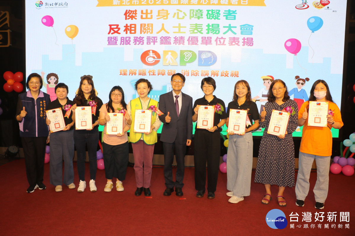 新北市響應國際身心障礙者日今年主題「理解隱性障礙 消除誤解歧視」,與身權公約之精神,運用公益彩券盈餘分配基金,今(6)日於市府表揚傑出身心障礙人士、模範家屬、績優服務及有功人員等32名;另有23家評鑑績優的社區式服務單位。副市長陳純敬代表侯友宜市長頒獎,他說新北市有超過18萬身障人口,新北的輔具超音速服務和復康巴士服務數量都是全國第一,與身障朋友在心靈上「無距離」。