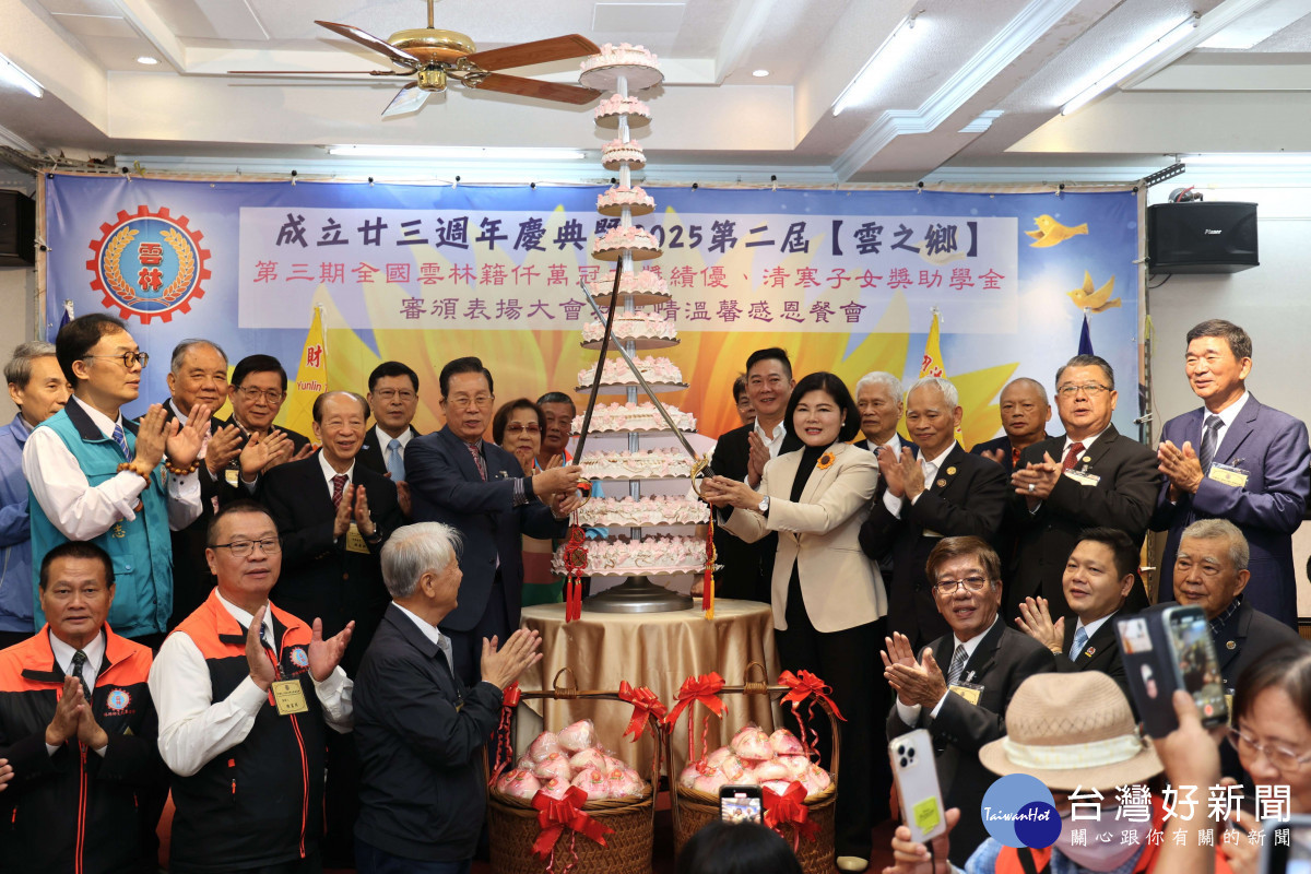 由全國各地旅外雲林鄉親所組成的財團法人雲林同鄉文教基金會,今(22)日齊聚虎尾鎮明鳳食寓宴會廳辦理成立23周年慶典大會,會中並頒發2025第二屆雲之鄉第3期冠名獎助學金,由董事長譚量吉及常務監察人張朝國等81位董監事及旅外鄉親共襄盛舉,捐助930萬元獎助學金,計有310名國中及高中職學生受惠,展現旅外雲林人長期回饋教育、扶植青年的深厚情義。