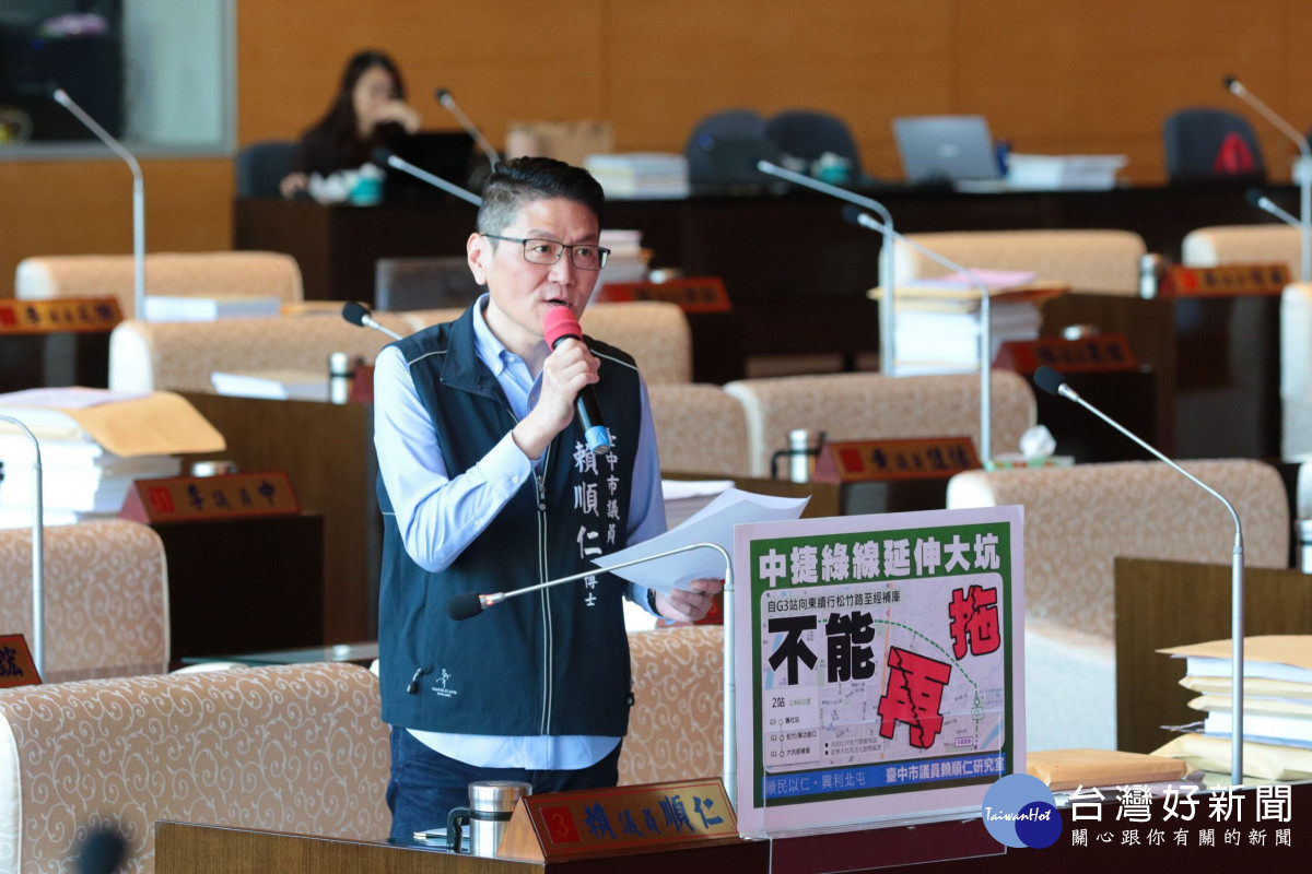 賴順仁不滿表示,市府總是已「積極辦理中」、「持續溝通中」等官話敷衍,他要求市府具體承諾綜合規劃報告送出大門的確切日期,而不是讓環評與都計變更程序淪為拖延戰術。捷運建設不能變成無止盡的等待。若彰化段用地遲遲無法交付,大坑段是否真的能獨立動工?還是只是好聽話?他要求市府必須正視採購與工程介面問題,提出具體的「脫鉤策略」,若彰化都計無解,大坑段就必須先行,絕不能讓兩段工程互相綁死。