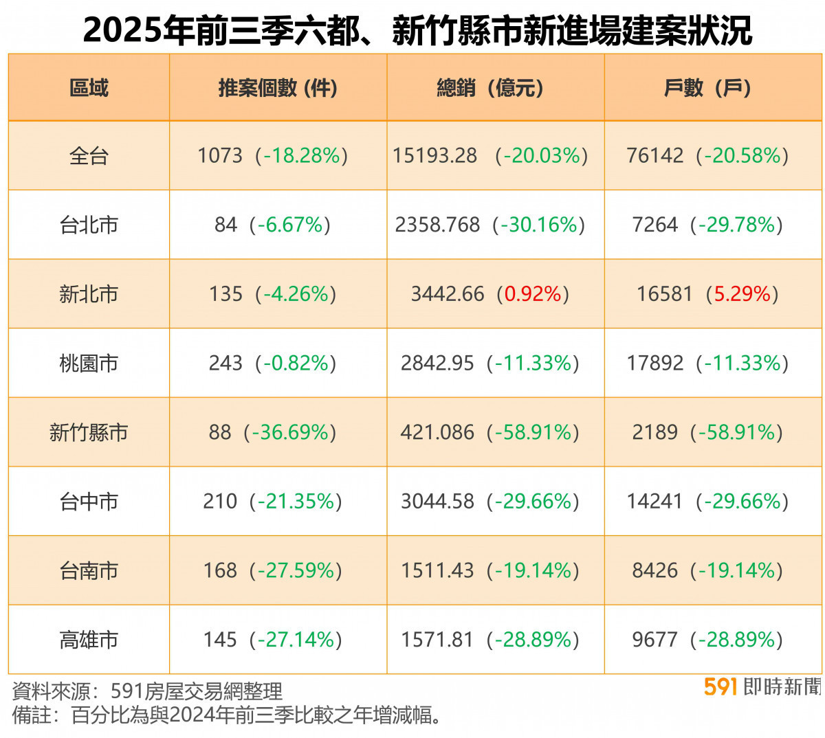 2025 年房市在政策調控下持續盤整,市場觀望情緒升高。591新建案統計,今年前三季六都加新竹推案總銷約 1.5 兆元,年減約 20%,整體推案量 1,073 個、年減 18%,成交量亦同步縮減。觀察季度變化,第一季受春節與金龍風暴影響,市場全面降溫;第二季雖仍有政策干擾,但較前一季略有回穩;第三季案場人潮持續下探,即使建商讓利並有 9 月政策鬆綁,加溫效果仍有限。