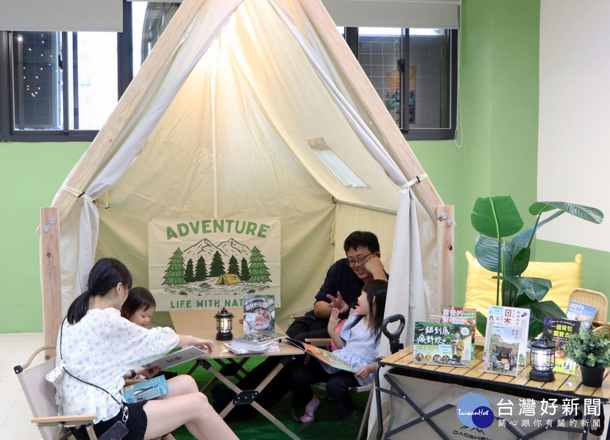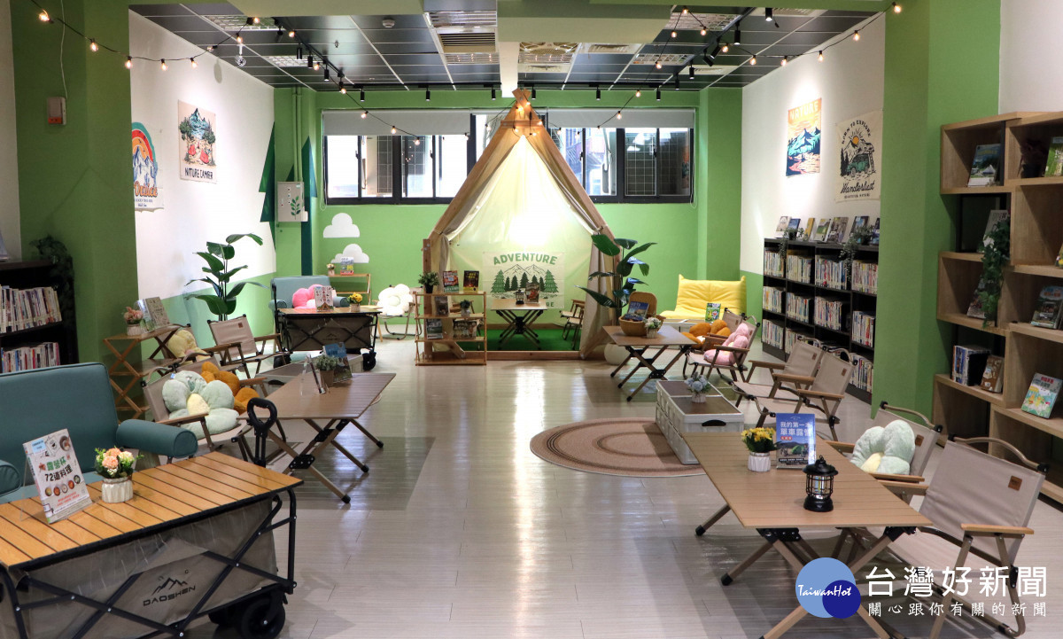 為了提供民眾安全舒適的閱讀空間,經過8個月的空間改造,今(28)日重新開館的中和員山分館,揮別以往的老舊氣息,結合近年來流行的「Outdoor」風潮,打造了超吸睛的露營風閱讀角,帳篷、露營椅、草坪、露營燈等露營裝備一應俱全,讀者除了能坐在露營用的折疊椅或是收納箱看書,也可跟三五好友躲進營帳內,享受野營閱讀的放鬆氣氛。一開館,現場便吸引不少文青前來拍照打卡。