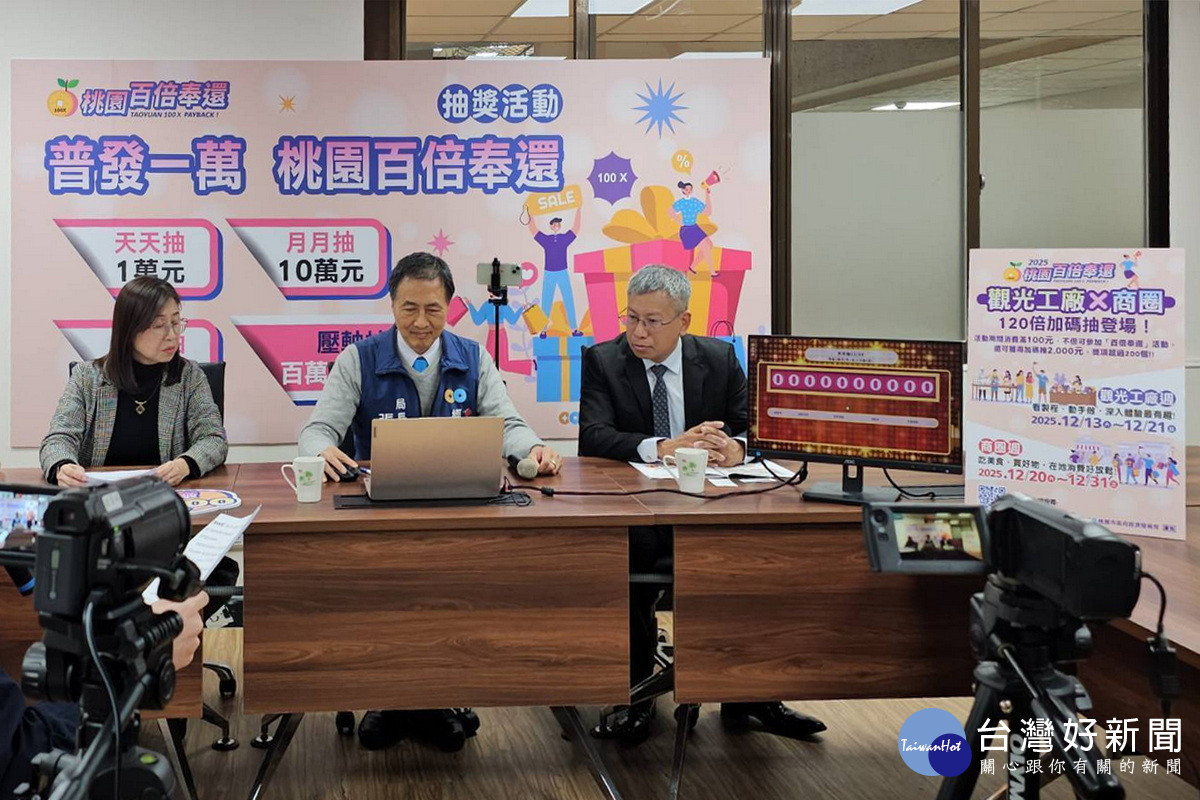 「普發一萬 桃園百倍奉還」活動將持續至12月31日,活動期間於登記地址在桃園市的店家消費並開立有效發票者,只要於115年1月7日前完成登錄,即可參加抽獎,有機會把百萬現金帶回家。更多活動資訊,請上「桃園百倍奉還」官網查詢。