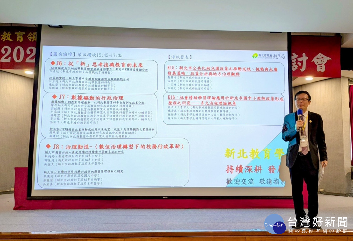而在技職教育方面,技職教育科長江彥廷以「USR視角下的技職教育轉型」與「國中小職涯試探成效分析」兩篇研究報告發表成果。他指出,新北已建置16所職探中心、七大類體驗課程與數位職探資源,兩年累計超過18,000名國中小學生參與,帶動學生適性探索;另透過「技職體系融入社會」的模式,讓技職教育從「為工作而學」進化為「為社會改變而學」,累積超過1,200名學生參與永續行動設計,讓技術成為能改變社會的力量。