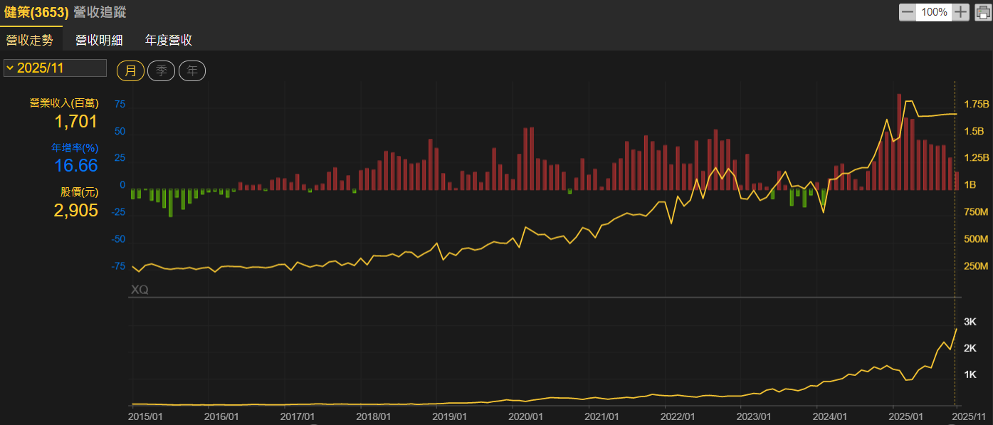 台灣散熱產品(營收占比65.54%)&導線架(營收占比13.64%)專業廠健策(3653),公布11月營收為17.01億元,月增率0.03%,年增率16.66%,連6月年月雙增、今年來連11月年增;累計今年1至11月營收總額為184.06億元,年增率達45.76%。