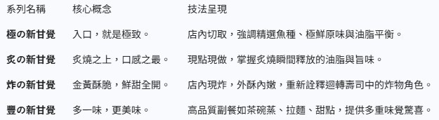 「新甘覺」將餐點劃分為四大系列,從壽司本質到豐富副餐,為顧客帶來更全面且層次分明的味覺體驗: