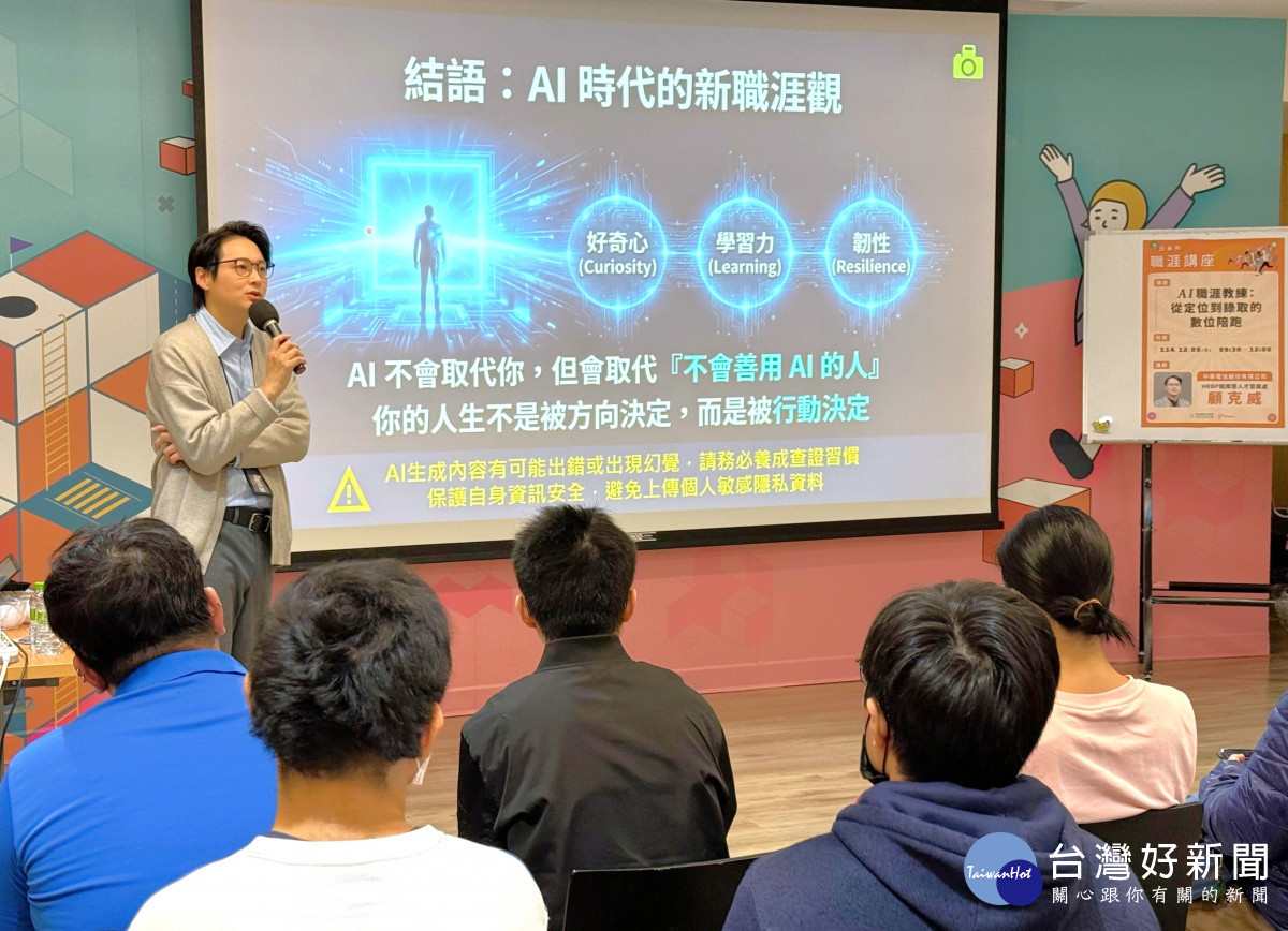 職涯講座以「AI職涯教練:從定位到錄取的數位陪跑」為題,邀請中華電信人力資源管理師顧克威主講,聚焦青年最關注的求職力養成。強調在AI時代企業對新人的評估不再僅限於學歷,而更重視能以具體事證展現的能力表現;同時熟悉AI工具已成為近年企業高度關注的關鍵技能。