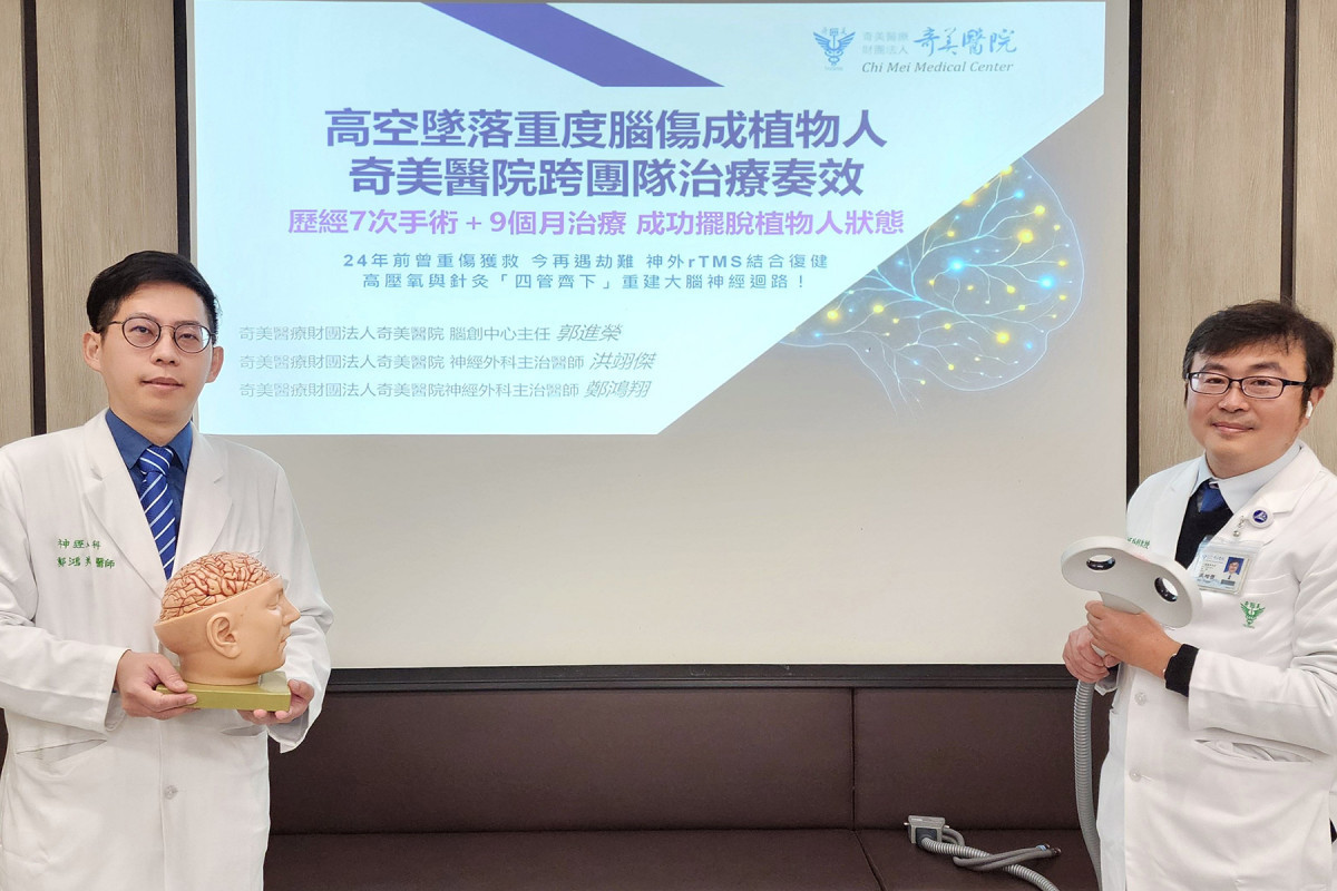 奇美醫院腦創傷中心主任郭進榮表示,在腦傷後1至3個月的創傷性腦損傷,導致意識障礙的病人,該院導入重複性經顱磁刺激技術,作為一種促進意識恢復的輔助治療。此外,更跨科部整合,結合高壓氧、中醫針灸與復健治療,全方位提升腦傷病人的復甦機會。