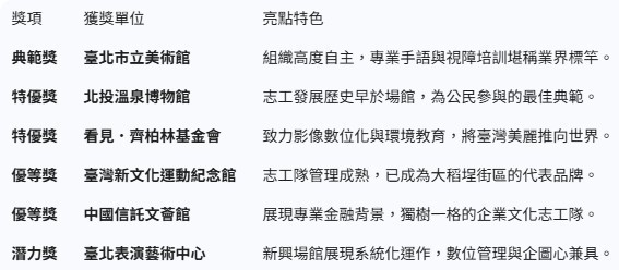 文化局表示,透過評鑑與獎勵制度,不僅是給予榮耀,更希望能提升大眾對文化志願服務的重視。得獎單位的管理經驗將成為北市各場館的示範,攜手打造更具溫度的「都會文化生活圈」。