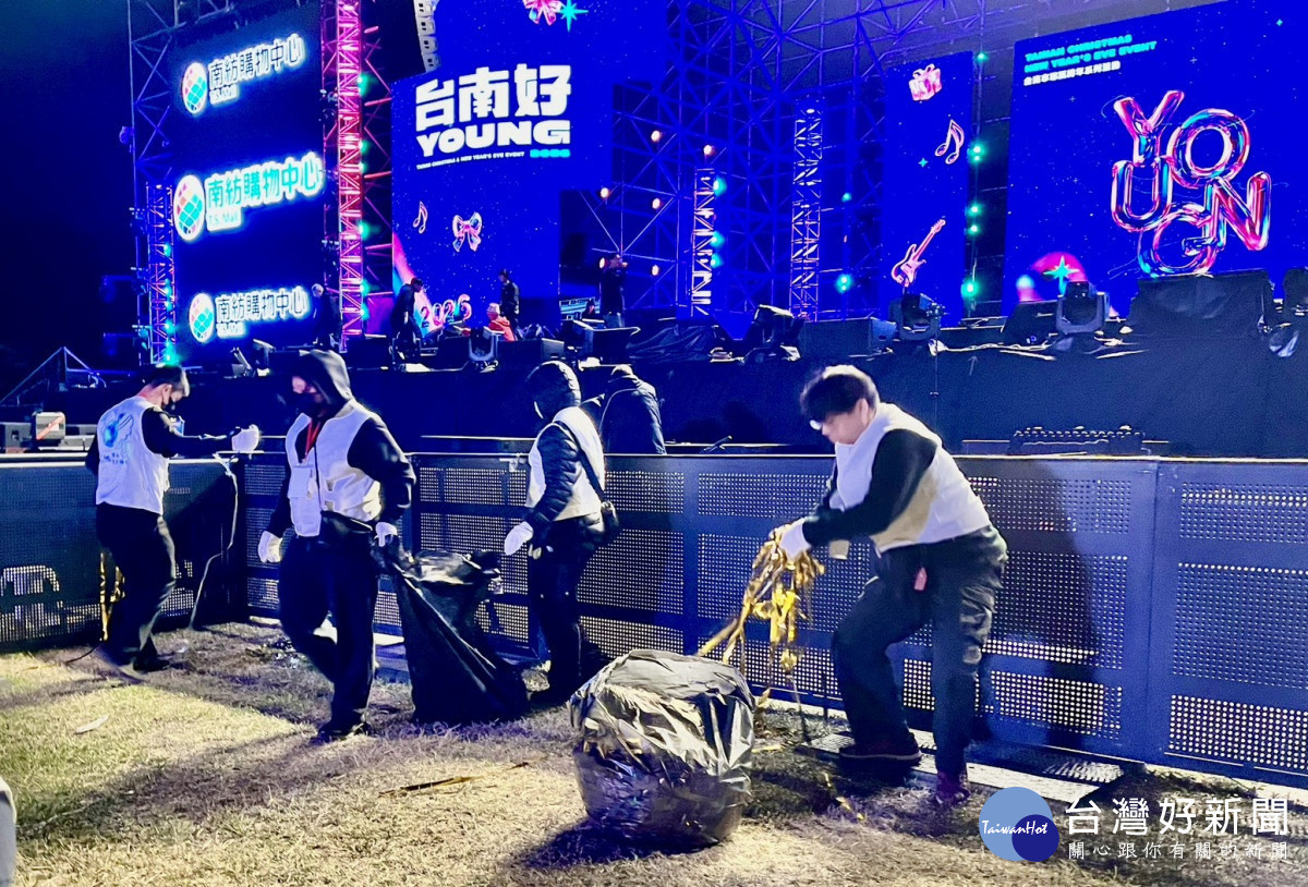 長達7小時的「2026台南好Young」跨年晚會在30萬人次的依依不捨中,圓滿落幕。黃偉哲市長祝福大家馬年一馬當先、馬上幸福、馬上有錢賺。而為了迅速恢復市容,主辦單位及招募的工讀生、攤商清潔人力及環保局通力合作,動員近90名清潔人力,1日凌晨2點左右,完成主場地清潔復原,總共清運7噸垃圾,並資源回收約650公斤,美食攤商區並於凌晨約4點完成場地清潔復原。