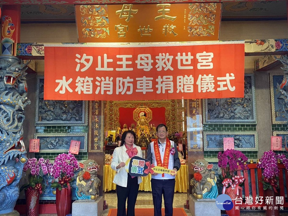 王母救世宮於2016年安座於汐止,供奉王母娘娘與金母娘娘,數年來不僅香火鼎盛,更以「慈悲救世、護佑眾生」為宗旨,長期投入社會公益,近年來已連續捐贈災情勘查車及多項裝備器材予警消團體。這次捐贈的水箱消防車為2噸級水箱車,配備高壓泵浦、可迅速於無消防栓地區獨立供水,特別適合汐止山坡地住宅、老舊社區巷弄及基隆河沿岸災害搶救。