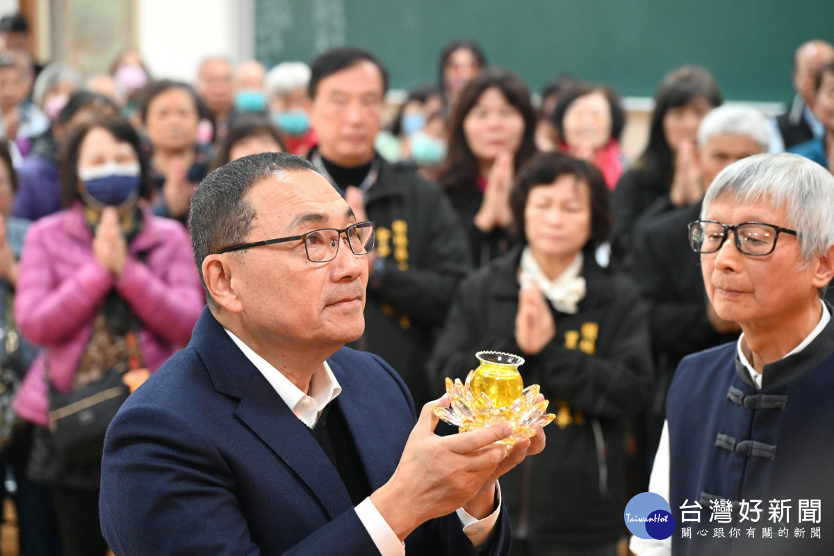 侯友宜說,從小母親就叮嚀,遇到危險稱念「阿彌陀佛」佛號就可化解、保平安,正是透過這樣宗教信仰的力量,公職生涯50年可以心無所懼為台灣做事。目前新北公托已達 128 家、日照即將達到 130處,除持續和里長、議員、立委一起努力,為市民創造安居樂業的宜居環境,也祝福大家馬年吉祥、馬上加倍幸福。