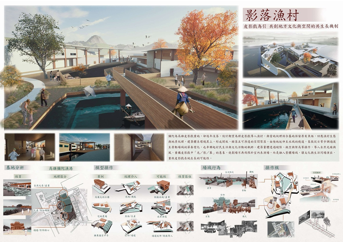 入選獎作品「影落漁村」由杜善揚老師指導大四生陳為軒設計,以「從文化扎根」為核心,將高雄彌陀逐漸沒落的皮影戲文化,轉化為融入漁村日常的空間系統,透過光、影、水域與聚落關係,讓傳統藝術重新回到生活現場。