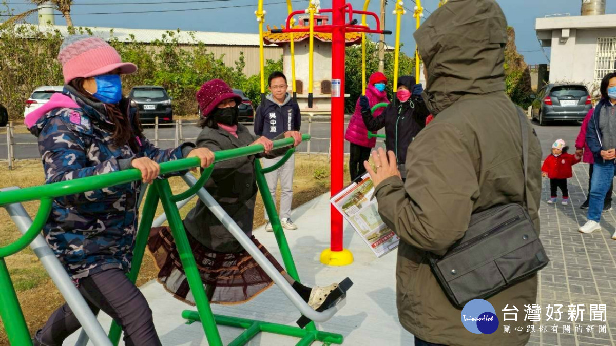 吳中源表示,原本納骨堂前這片綠地在去年建置好之後,純粹只是一片草地,經卓美華鄰長及附近居民向他反映,地方需要有一些大人及小孩使用的運動及遊憩設施,因此,邀集相關單位會勘,並積極向市府爭取259萬元來設置兒童雙人溜滑梯、搖搖馬與成人使用的三人轉腰器、三人上肢牽引器與雙人使用漫步機和洗手台。去年10月動工,12月底完工,可同時提供大人及小孩多人使用。