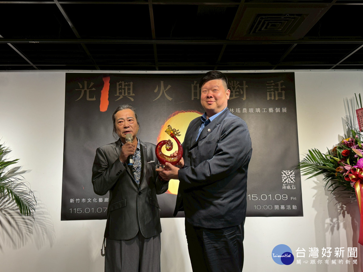 「光與火的對話-林瑤農玻璃工藝個展暨傳習師生展」即日起至1月25日於新竹市文化局文化藝廊展出。文化局長王翔郁9日出席開幕活動,接受林瑤農致贈作品《龍如意》予市府典藏,熱塑龍形玻璃盤捲而上,象徵飛龍高昇、吉慶如意,祝願新竹傳統玻璃工藝薪火相傳、光照前程。